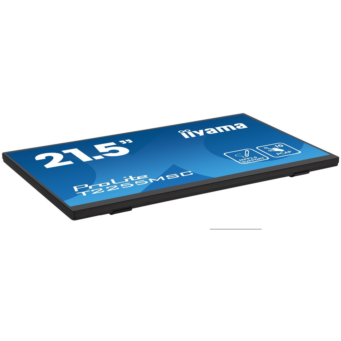 21.5in ProLite T2255MSC-B1 — optical-bonded PCAP 10-point touchscreen, IPS FHD 1920x1080, 5ms, 60Hz, HDMI/DP, USB hub, built-in speakers, anti-fingerprint glass, black.