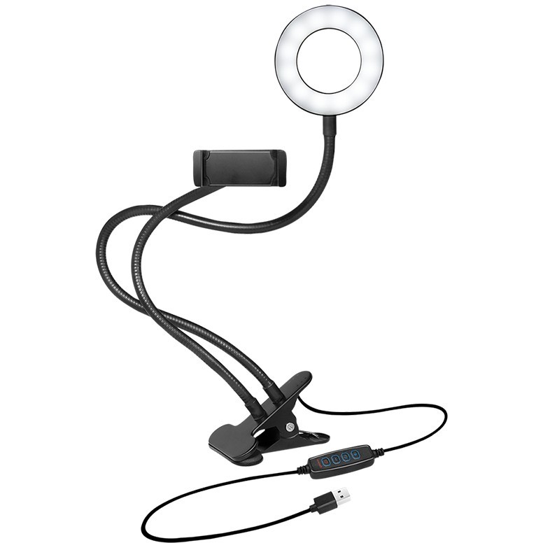 Compact smartphone ring light with a clamp mount. 8.5 cm diameter; desk/tripod compatibility; adjustable angle for hands-free lighting.