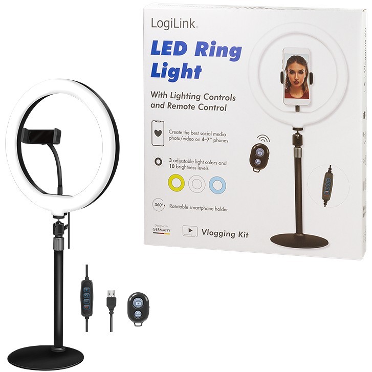 Logilink Smartphone Ring Light Tripod with Remote - Diameter 25 cm - USB-Powered