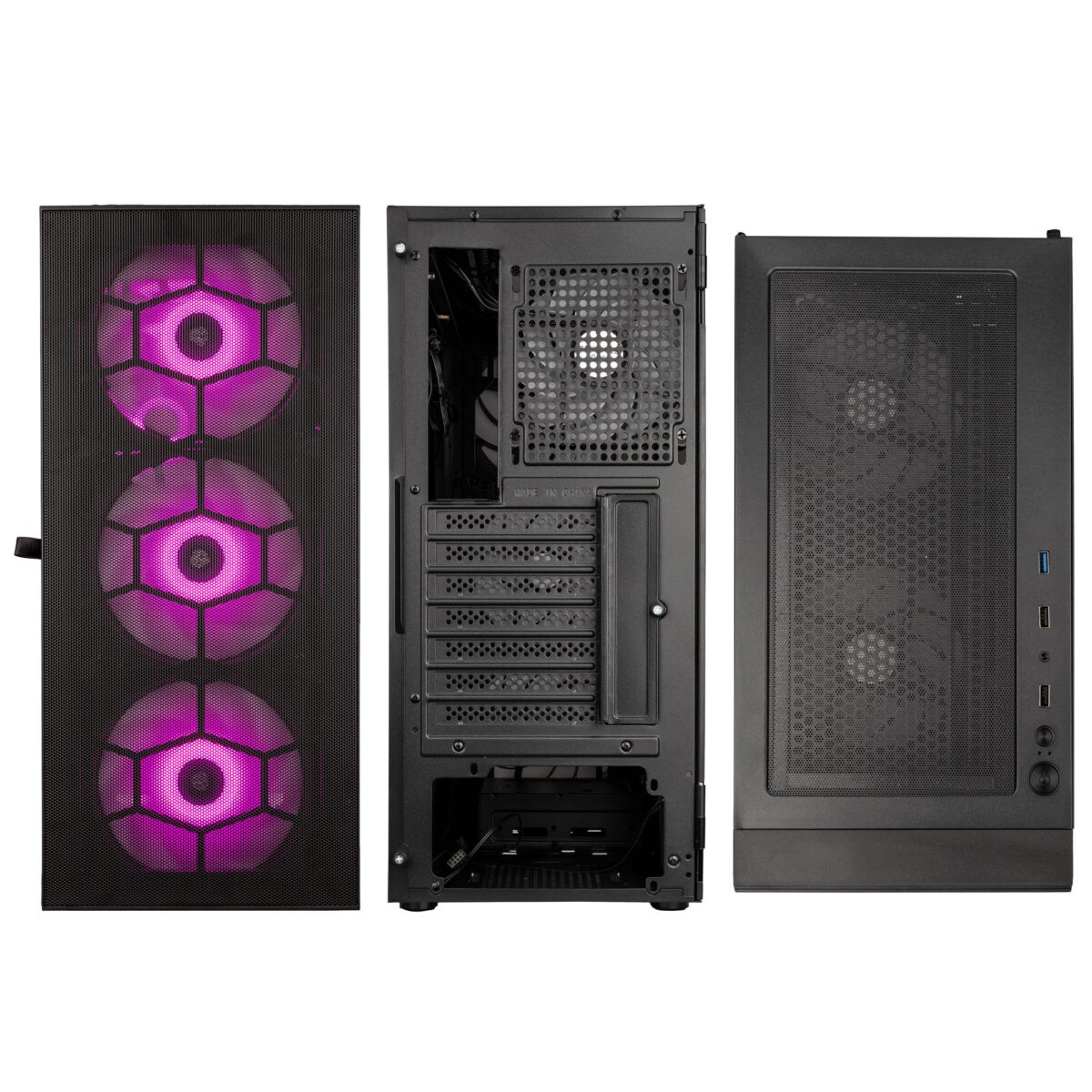 Sleek Observatory HF Mesh ARGB Midi Tower with six ARGB fans, mesh front with filters, and broad motherboard support (Mini-ITX to ATX) for airflow.
