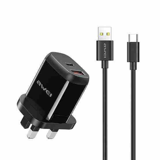 Awei PD1 Smartphone Charger Adapter - 20W USB-C PD + USB-A QC3.0 Fast Charger - Black