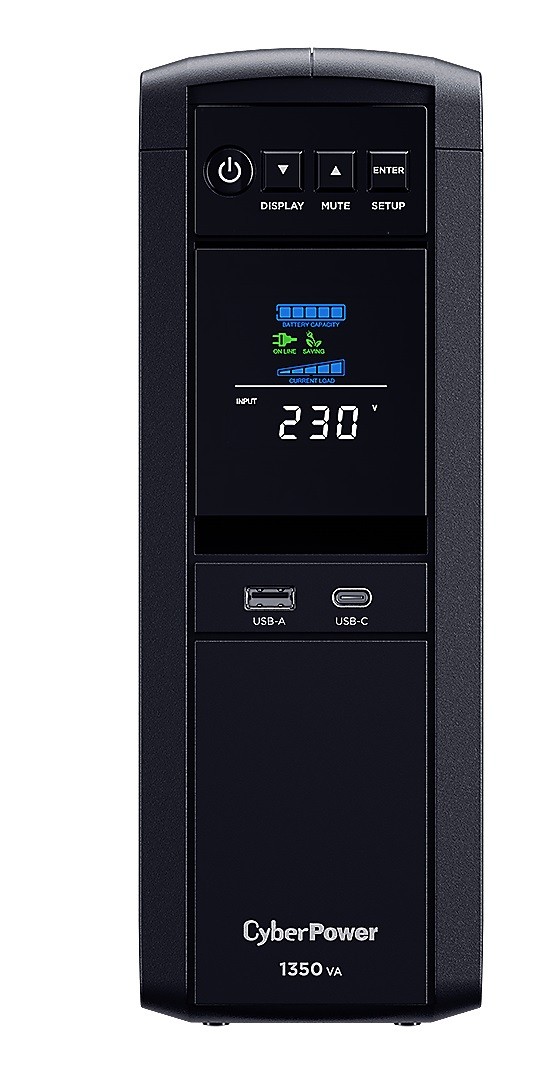 CyberPower CP1350EPFCLCD-UK with Pure Sine Wave output safeguards mid- to high-end computer systems, servers and networking hardware that use conventional and Active Power Factor Correction (PFC) power supplies. Designed with GreenPower UPS™ Technology to improve UPS operating efficiency and to minimize its energy consumption, this UPS delivers significant energy cost savings over conventional UPS systems.