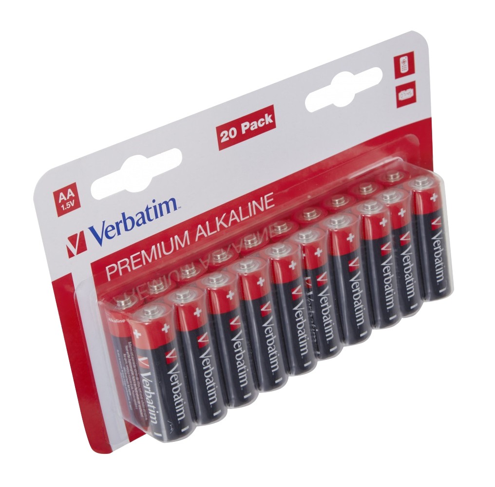Verbatim AA alkaline batteries (20 pcs) suitable for portable radios, MP3 players, cameras, and TV/DVD remotes.