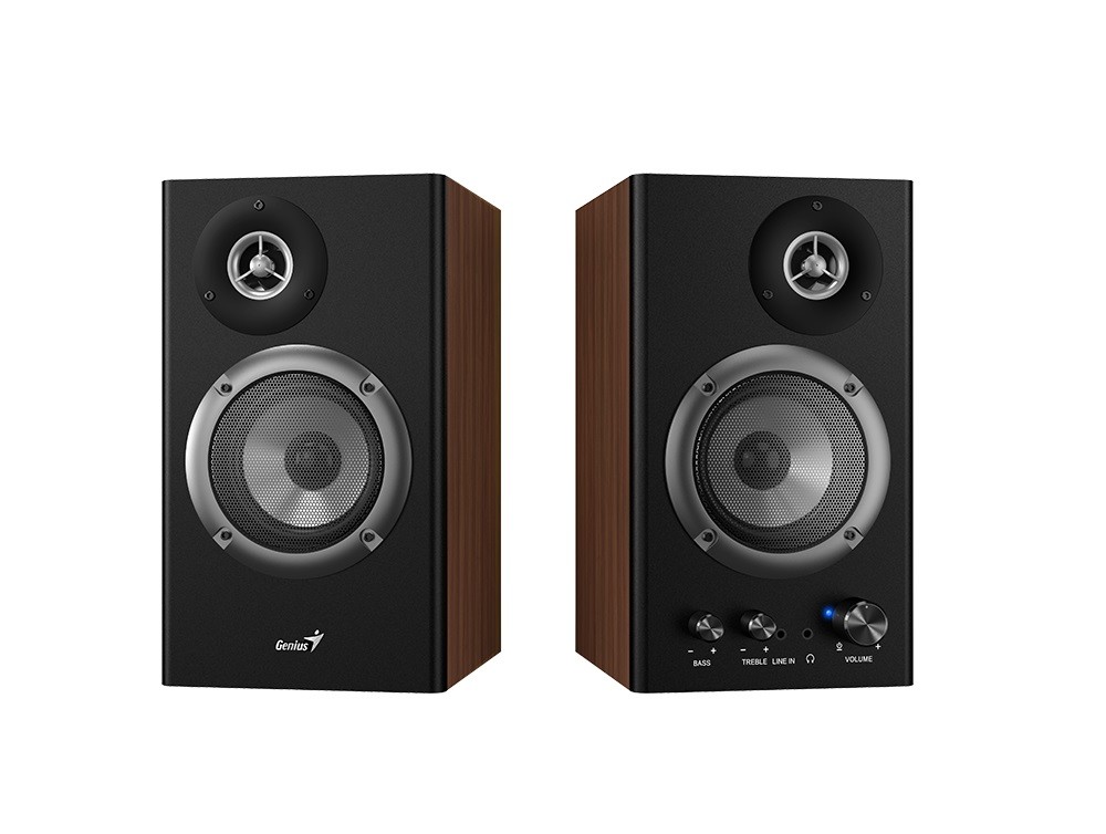 Genius SP-HF1200B 2.0 PC speakers deliver 36W RMS output with a wood finish; compact desktop sound for music, movies, and games.