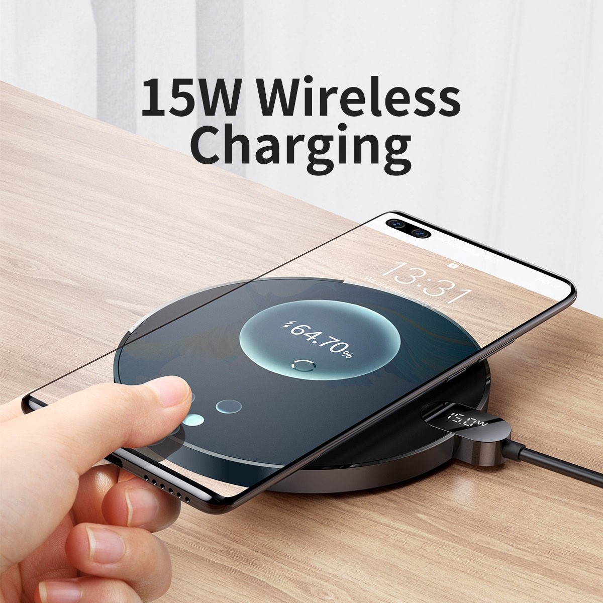 Real-time power and voltage display; 15W max output; FOD detects foreign objects; trickle mode prevents overcharge.