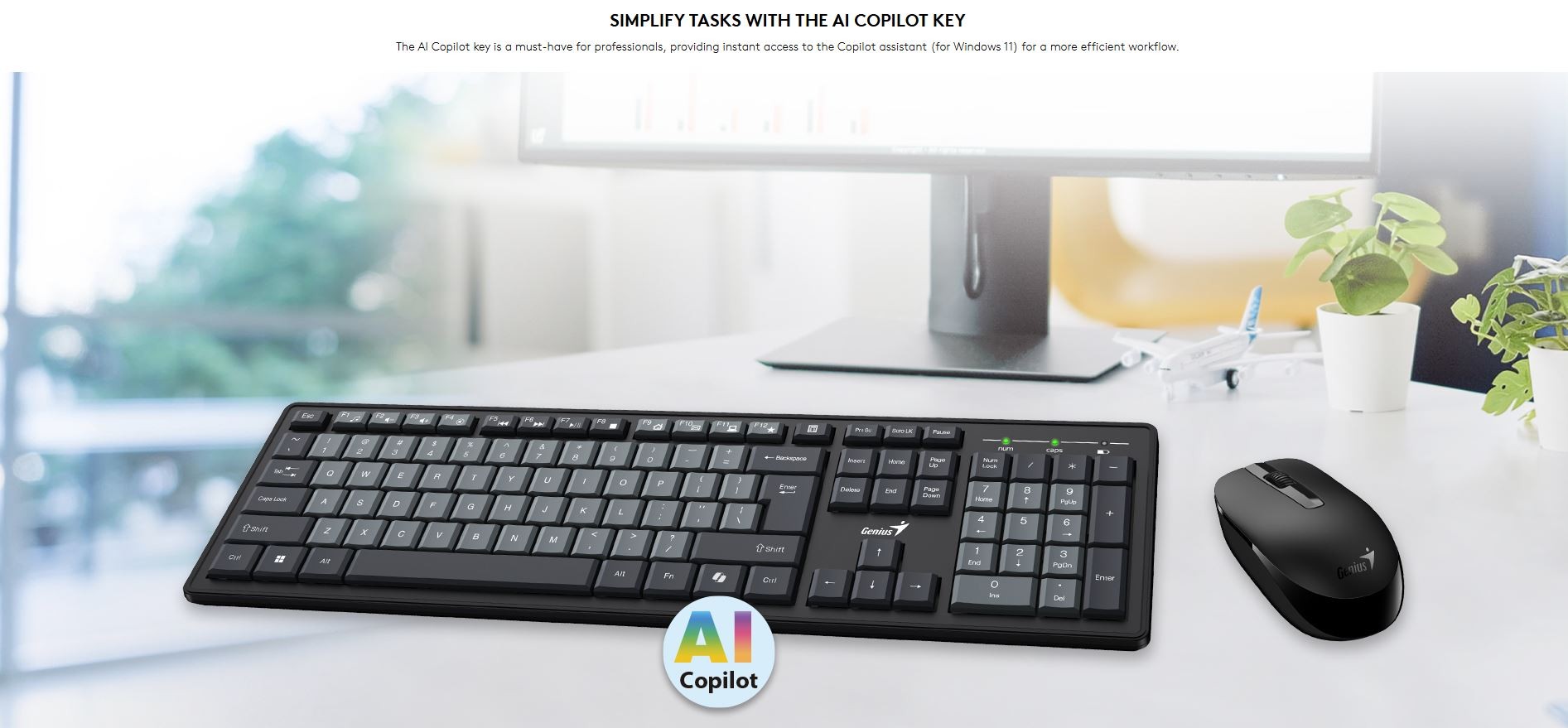 Wireless keyboard-mouse set with AI Copilot key for Windows 11+, slim keyboard with large keycaps, two-tone gray keycaps, and 12 multimedia keys.