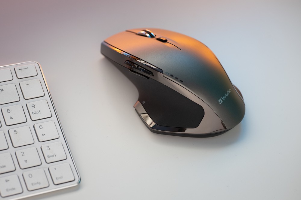 Wireless Verbatim mouse with 8 buttons and Blue LED for versatile navigation; 2.4GHz wireless connectivity.