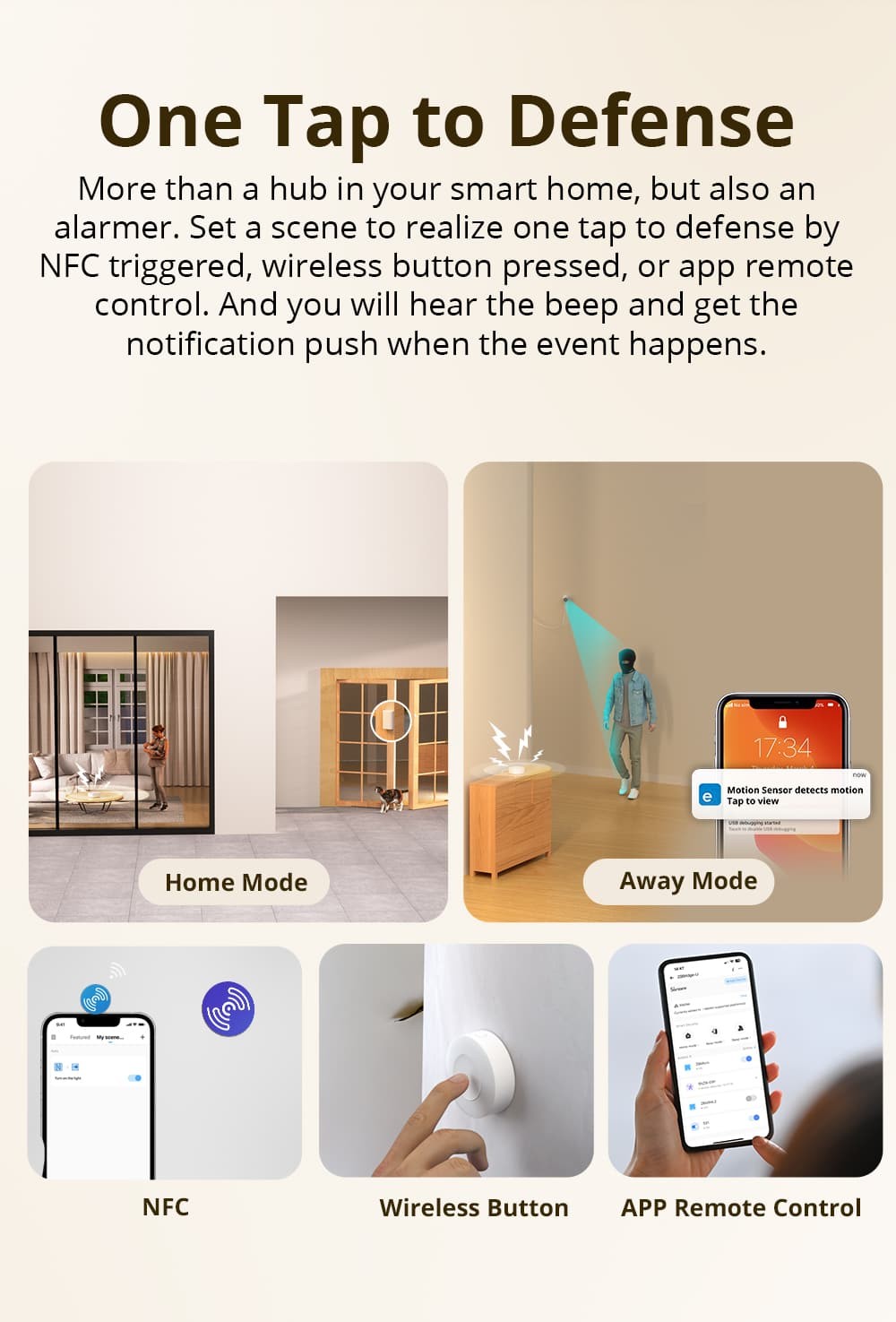 - Zigbee Bridge Ultra is more than a hub, it can also work as an alarm. Set a scene to realize one tap to defense by NFC triggered, wireless button pressed, or app remote control. You will hear the beep and get the notification push when the event happens.