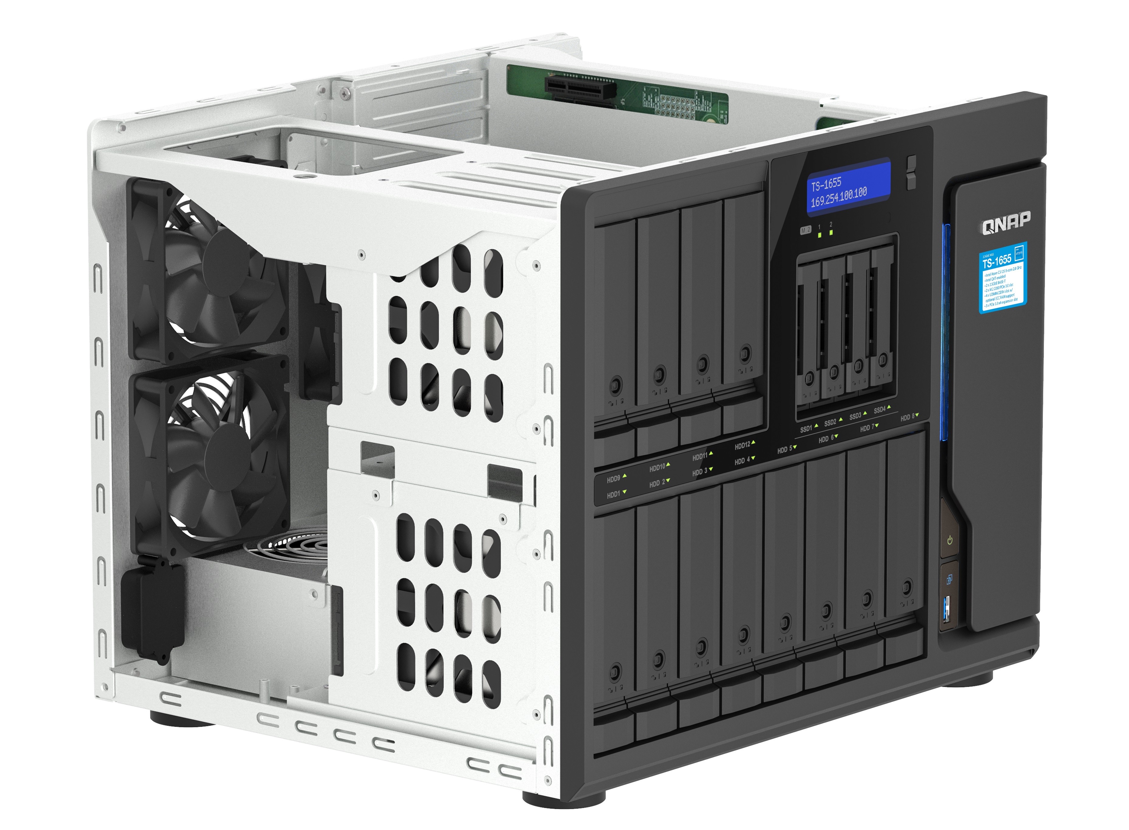 Balance performance and cost with hybrid storage. Designed for diversified business IT environments, the high-capacity TS-1655 has twelve 3.5-inch SATA drive bays (for HDDs) and four 2.5-inch SATA drive bays (for SSDs) with 2.5GbE high-speed connectivity. Fueled by an immense 8-core Intel Processor, the TS-1655 presents a secure, scalable, and complete business-ready storage solution for cross-team file sharing, collaboration, backup & disaster recovery, virtualization, and intensive data transmission. The TS-1655 will be available and supported by QNAP for an extended period (up to 2030), ideal for businesses requiring matching NAS models deployed in multiple locations.