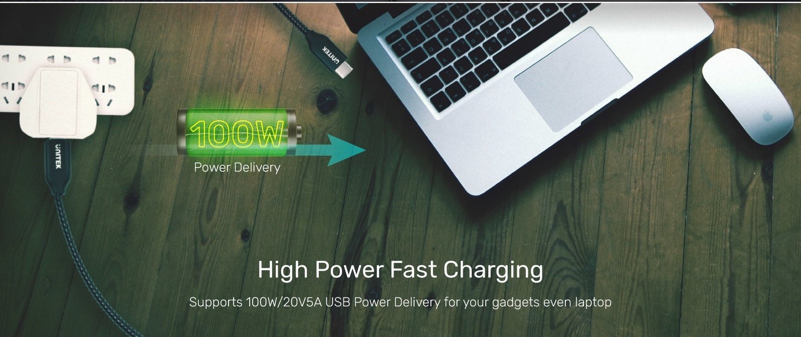 Unitek USB-C to USB-C braided cable with 100W Power Delivery; E-MARK chip supports up to 20V/5A for fast charging.