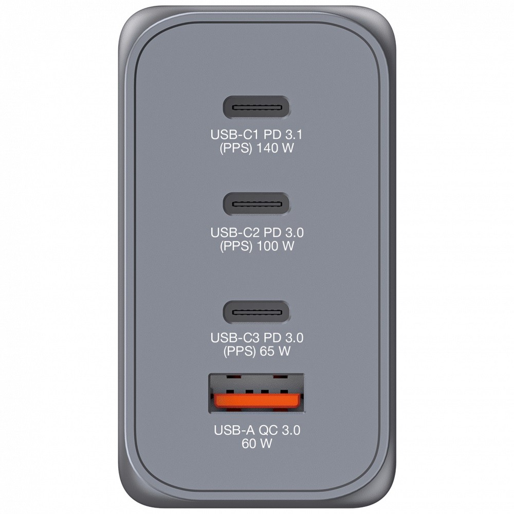 Four-port 240W GaN charger: 3 USB-C PD ports (140W, 100W, 65W) and 1 USB-A QC 3.0 port in a compact travel-ready design.