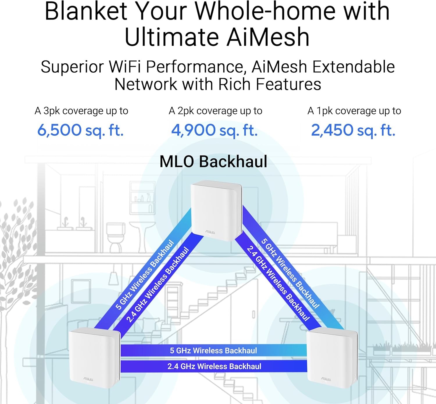 - ASUS AiMesh technology boosts coverage up to 6500 sq. ft. (3-pack) and easy extendibility with compatible ASUS routers for seamless and secure whole home WiFi