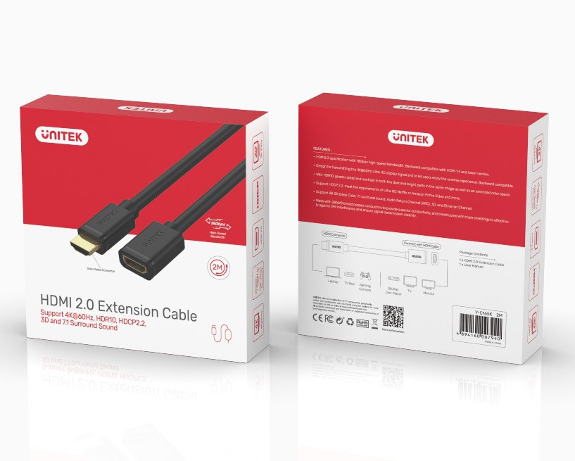 Unitek HDMI Extension Cable - Y-C166K - HDMI Male to Female 4K HDR Extension Cable 3m