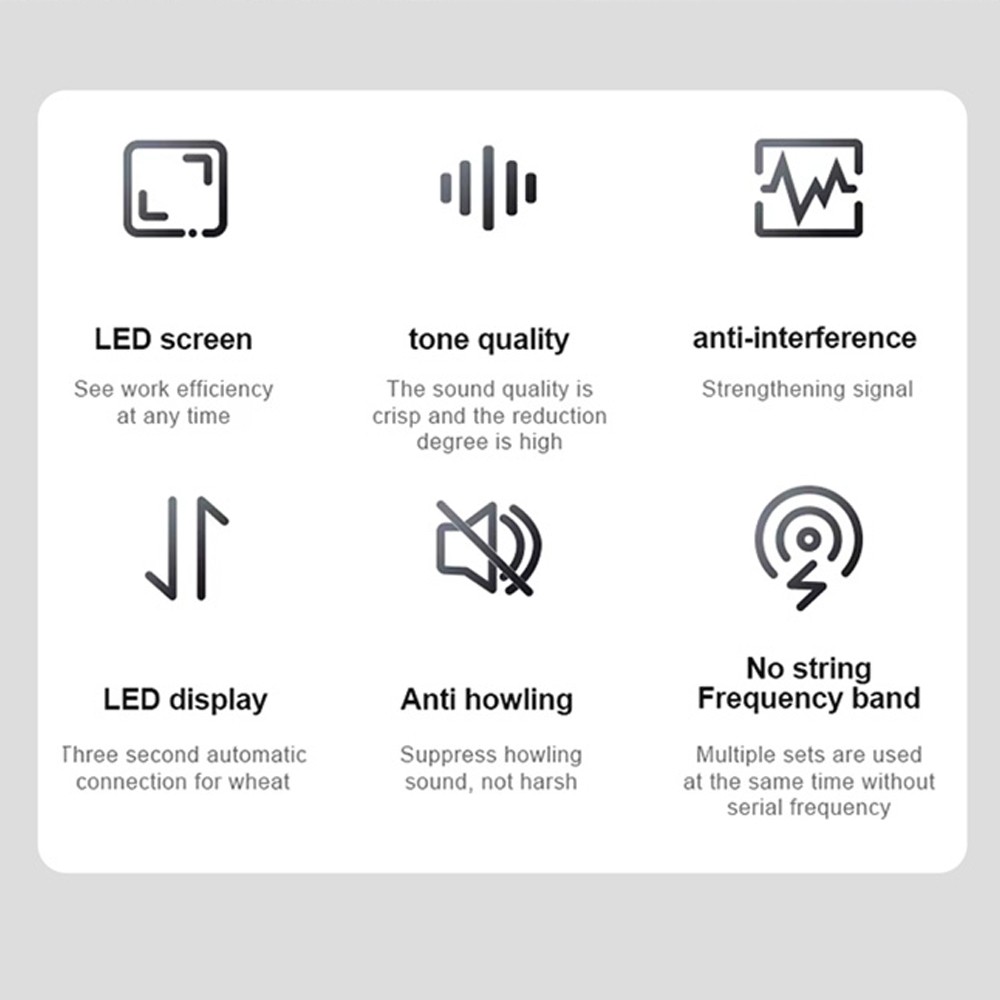 Dual wireless microphone system with 50m range, 7–8h battery life, 20Hz–20kHz response, and LED display.