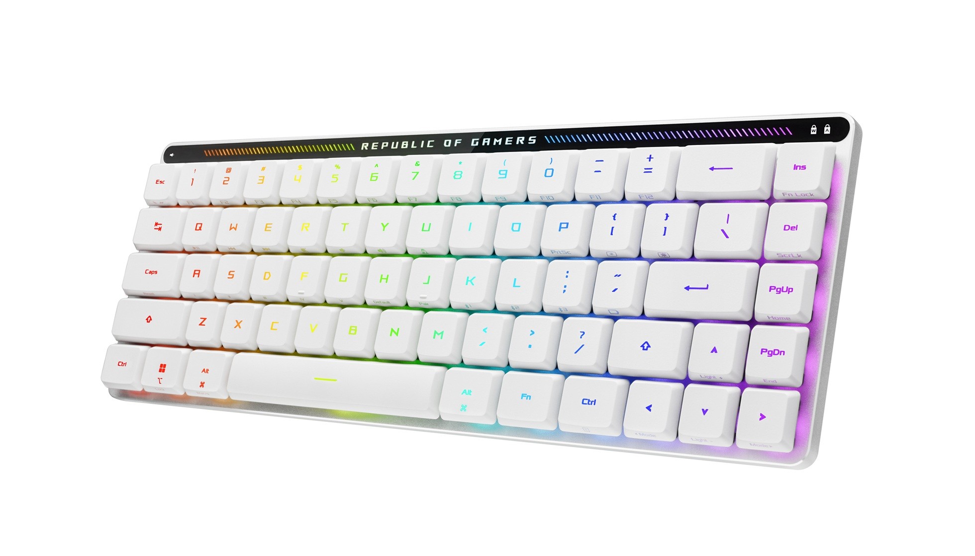 ROG Falchion RX Low Profile 65% compact wireless gaming keyboard with ROG RX low-profile optical switches, tri-mode connection with ROG SpeedNova wireless technology and Omni Receiver, protective cover, integrated silicone dampening foam, interactive touch panel, and MacOS support