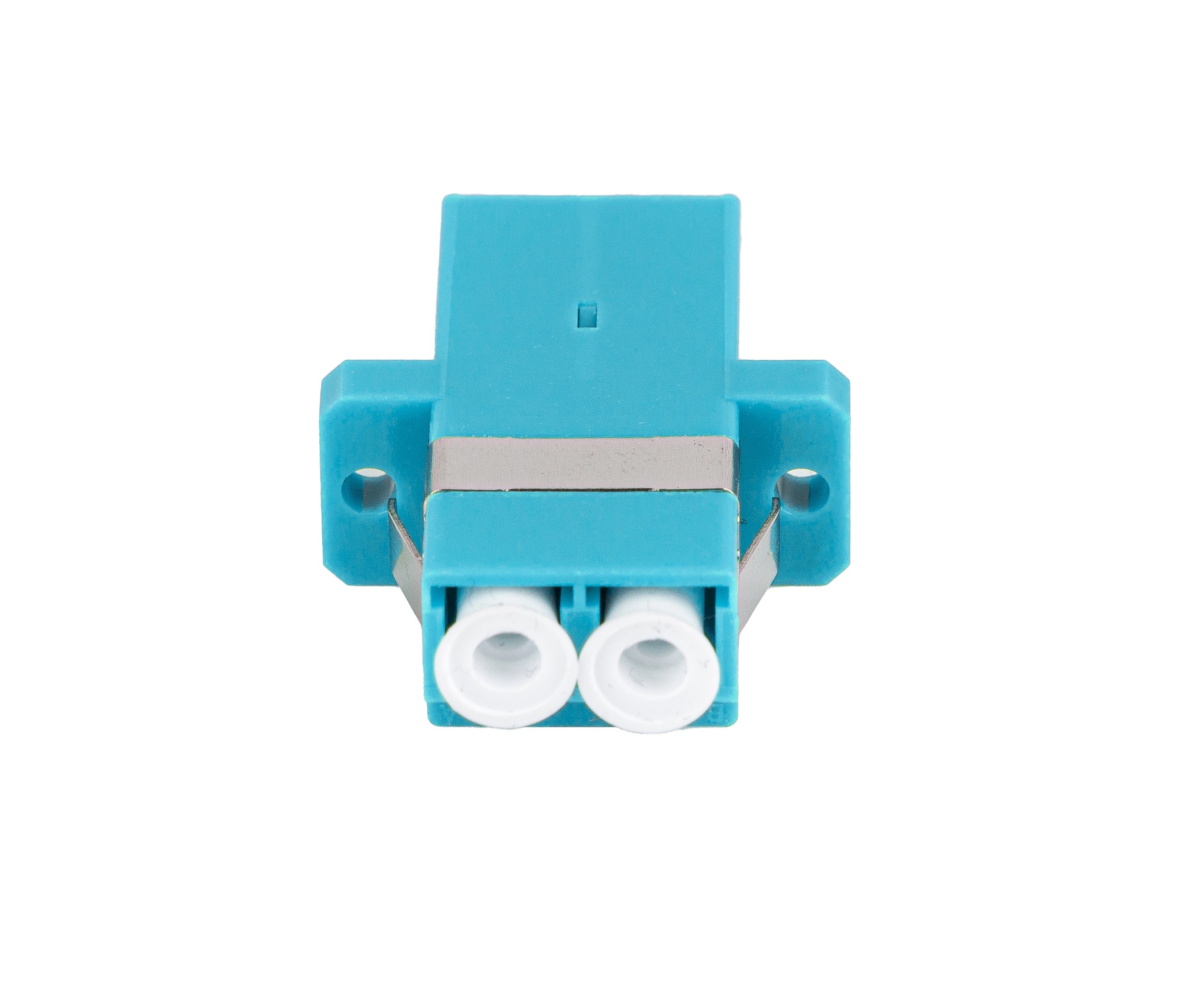 LC UPC MM Duplex OM3 fiber adapter with durable plastic housing and ceramic sleeve for low attenuation and repeatable performance.
