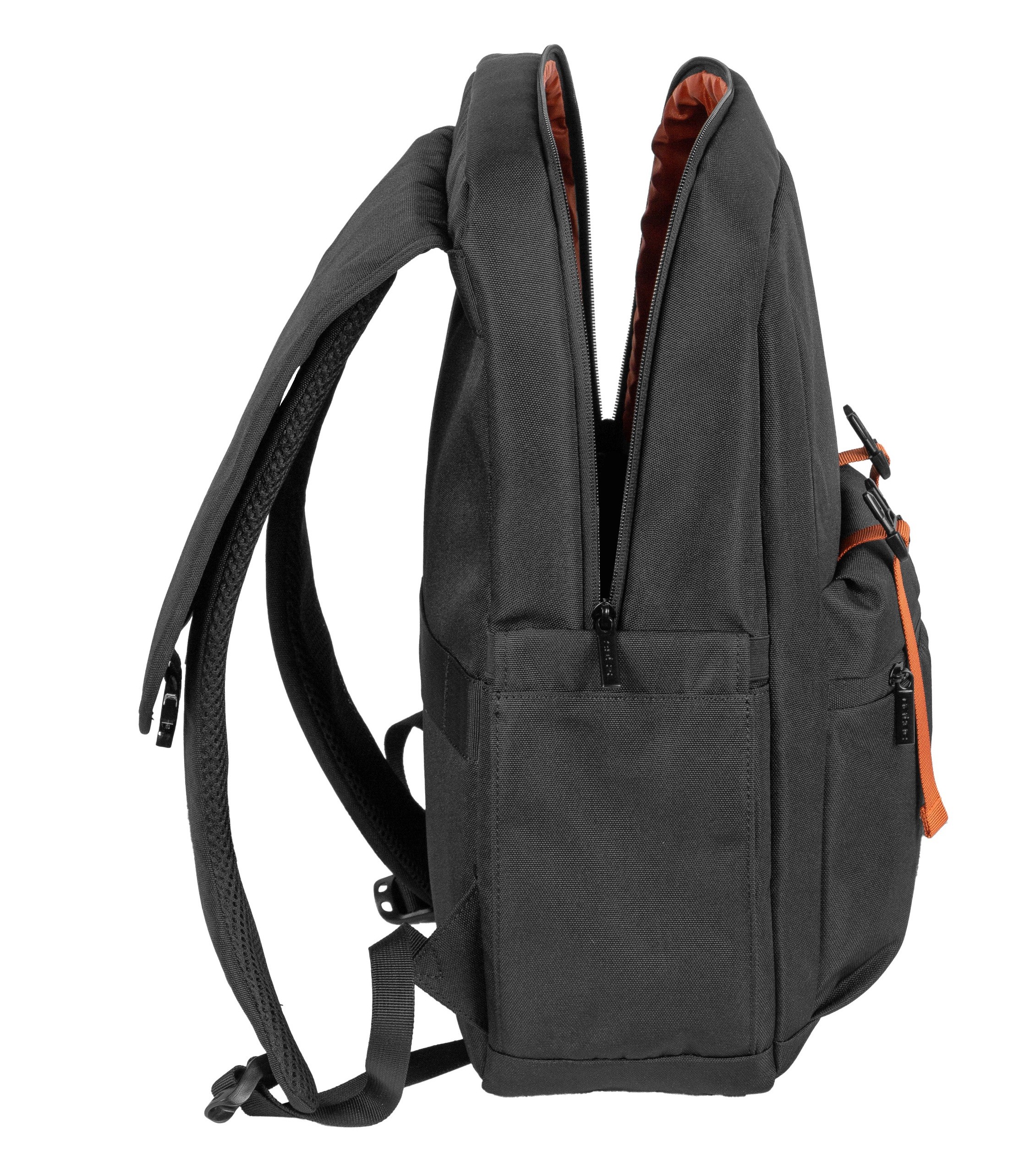 Urban 18L backpack made from eco-friendly recycled PET fabric; black with orange lining and unique ornaments; spacious main compartment.
