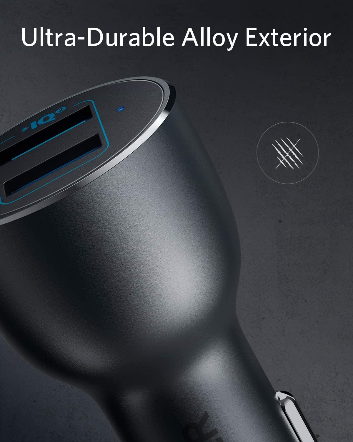 Anker PowerDrive III car charger with 2 ports delivering up to 36W total in an alloy Black finish.