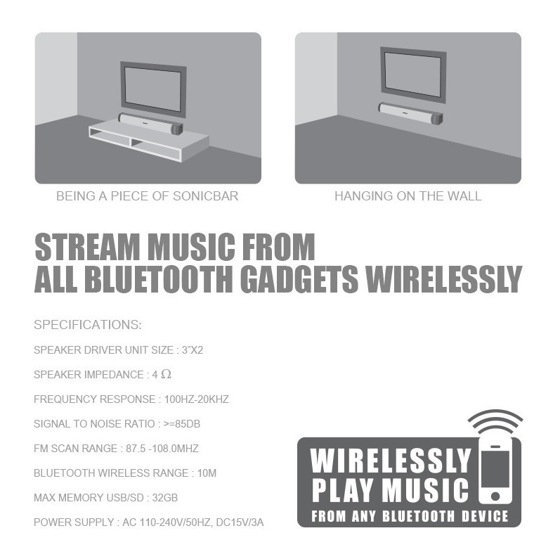 Wireless soundbar with 40W RMS output, Bluetooth streaming up to 10 m, FM radio, SD/TF card, and USB MP3 playback.