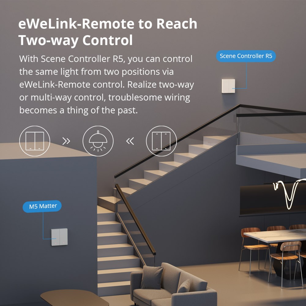 - eWeLink-Remote” Control : M5 Matter is a smart switch with the gateway function of “eWeLink-Remote“. With Scene Controller R5 or S-MATE2, you can control the same light from two positions via eWeLink-Remote control. Realize two-way or multi-way control, troublesome wiring becomes a thing of the past.