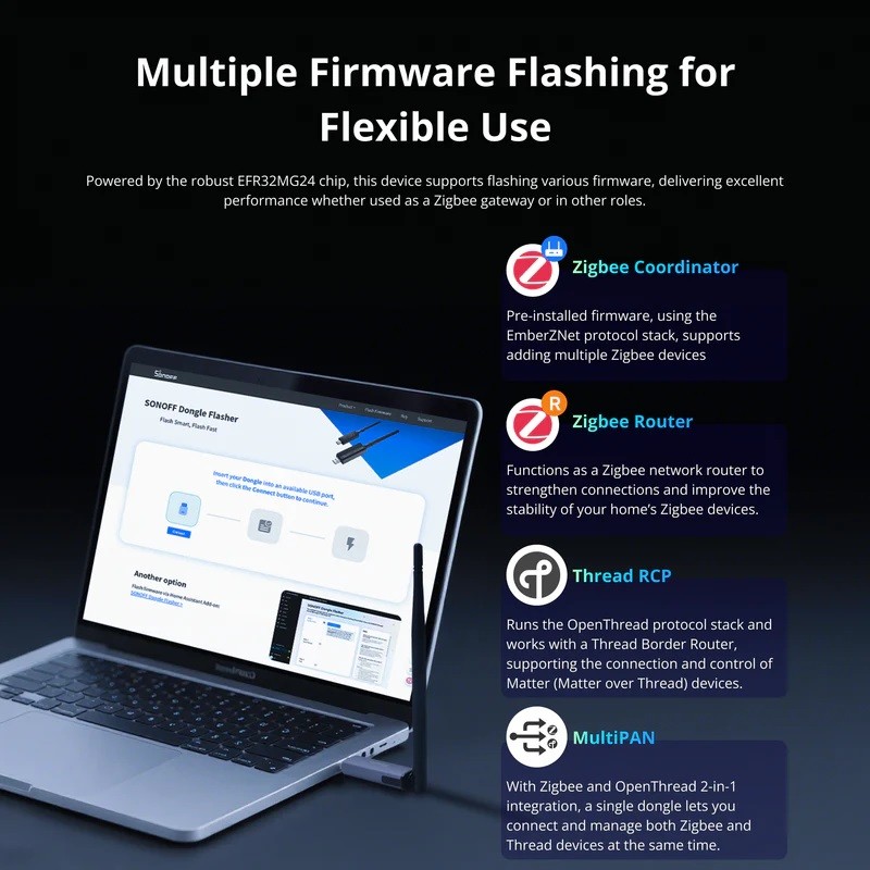 【Easy Firmware Flashing】Effortlessly flash different firmware using the SONOFF Dongle Flasher, enabling versatile roles and flexible usage.
