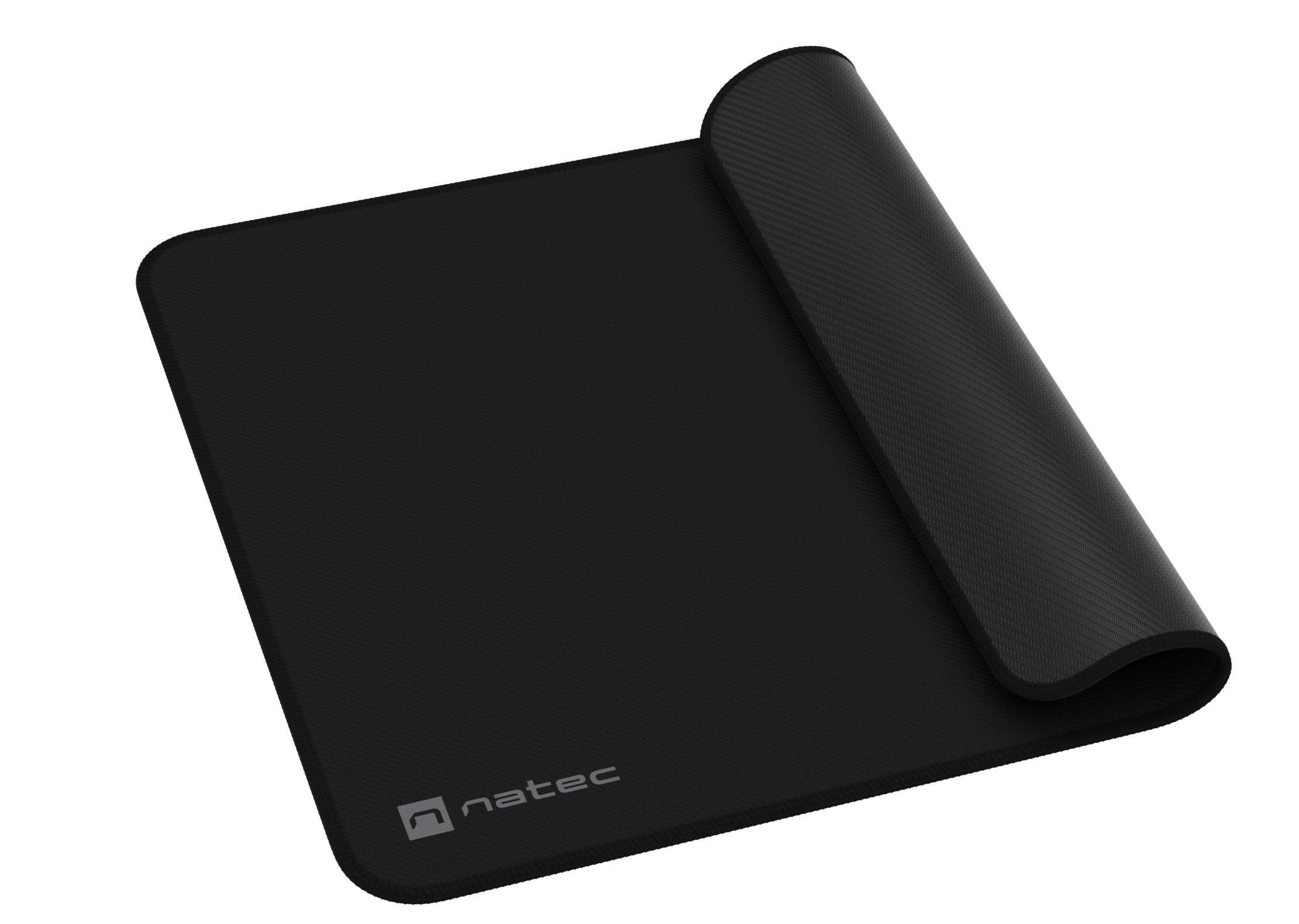 Medium Natec COLORS SERIES mousepad with soft textile surface, waterproof top layer, rubber non-slip bottom, and stitched edges. Black, 300 x 250 x 2.5 mm.
