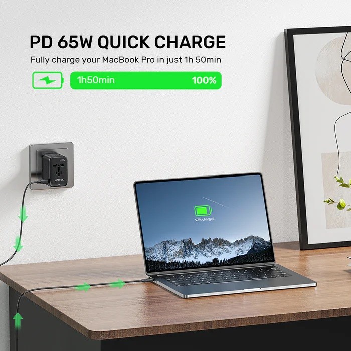 The UNITEK 65W universal travel adapter with 3 x USB-C PD charging port (Max 65W) and 1 x USB-A QC 3.0 charging port (Max 45W) that can charges up to 4 devices simultaneously. It is ideal to use for Travels, Business Trips or Studying Abroad. Built-in travel sockets can be used in more than 200 countries around the world.