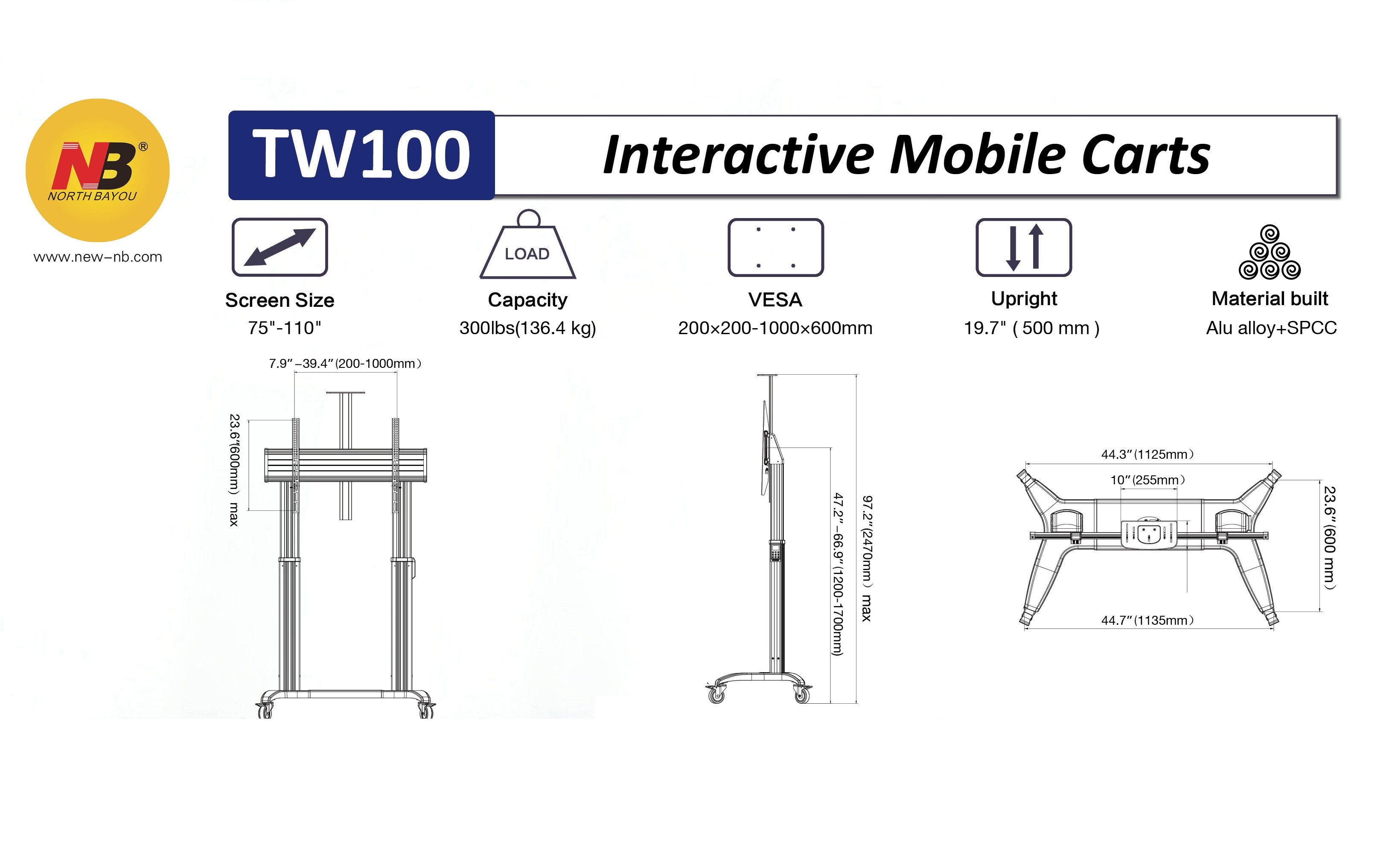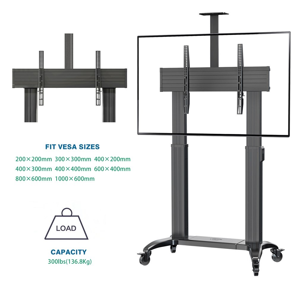 - Suitable for most 75"-110" LCD or LED flat panel TVs, TW100 is an innovative mobile display cart with a high tensile solid steel base, and with dual heavy-duty anodized aluminum alloy columns to withstand an overall 134 kg load
