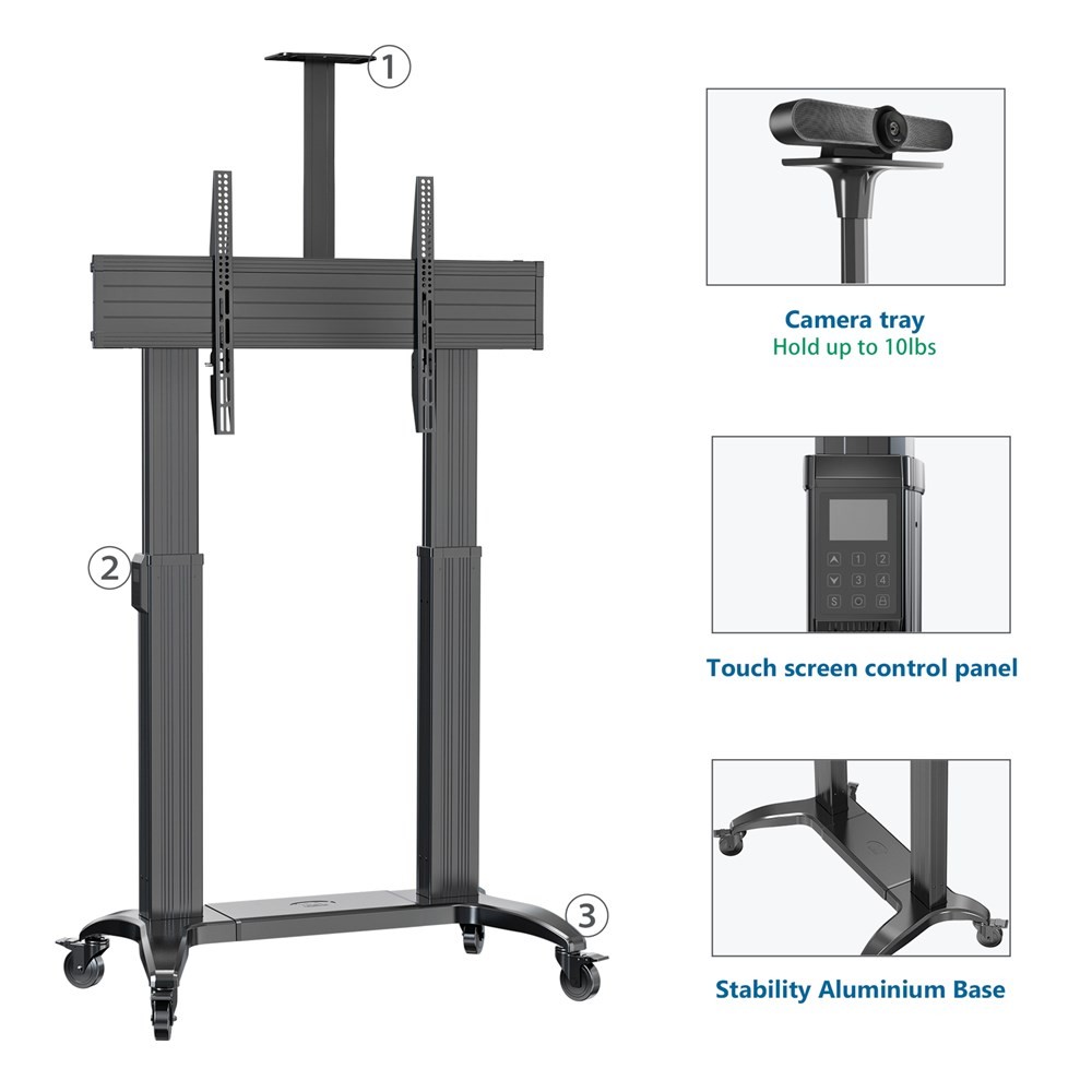 TW100 motorised TV trolley provides portable, heavy-duty mobility for large screens, ideal for entertainment, lectures, meetings, conferences and exhibitions.