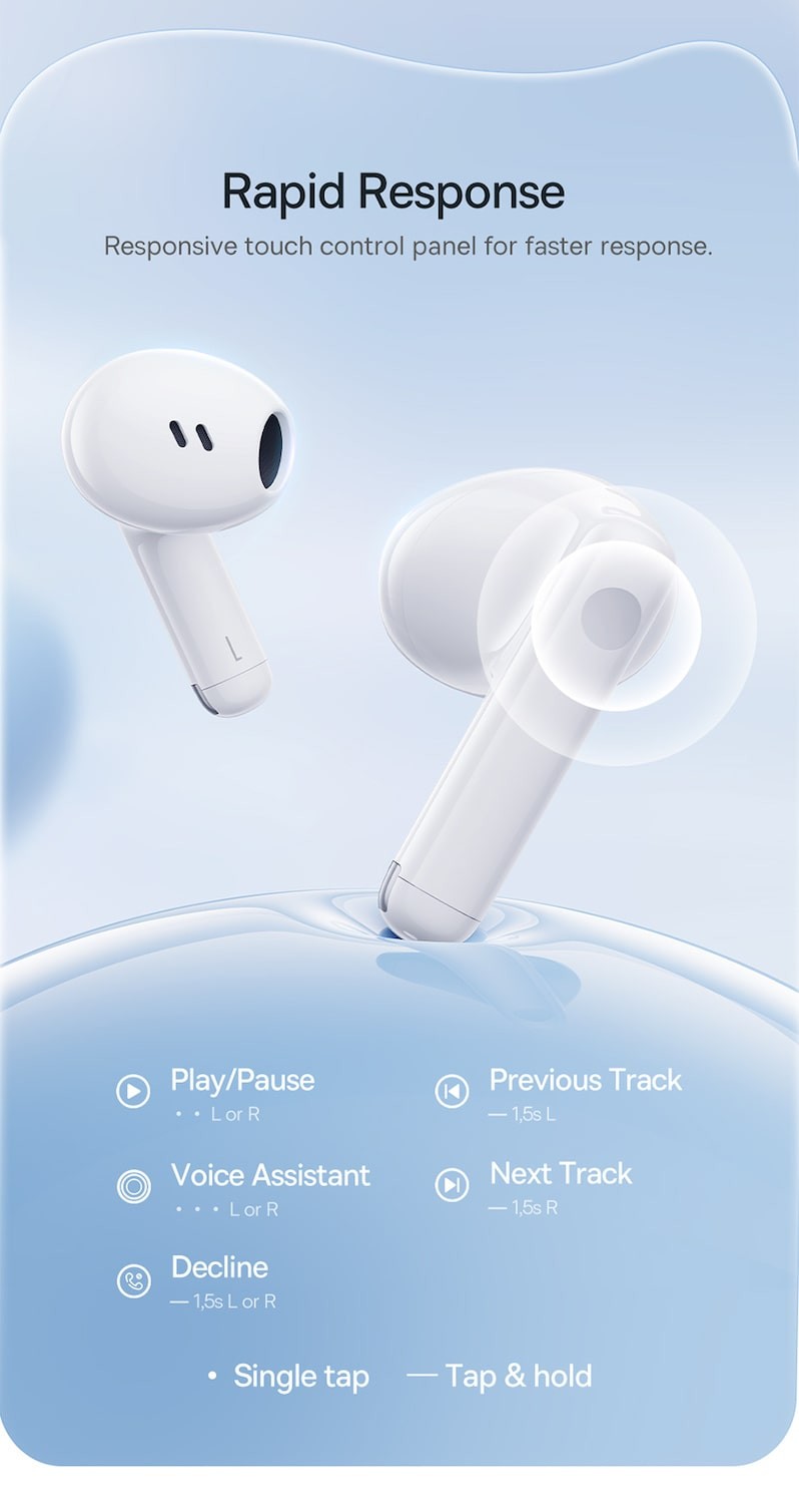 True wireless in-ear headphones with Bluetooth 5.3 for stable, independent left-right pairing.