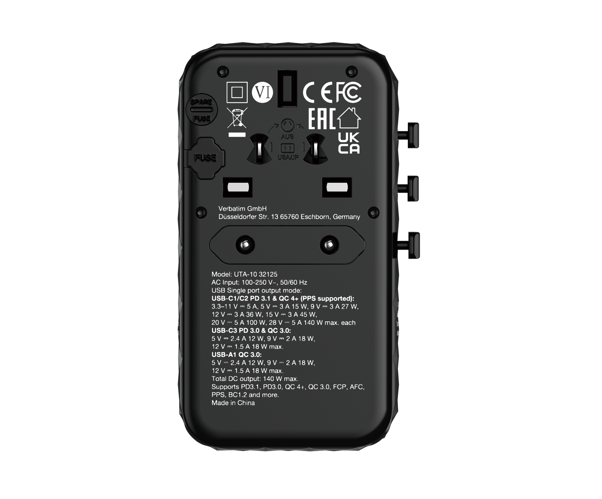 Housed in an attractive black 3D design, the Universal Adapter is made with high quality fireproof polycarbonate material and is certified by CE, UKCA, FCC and ROHS.