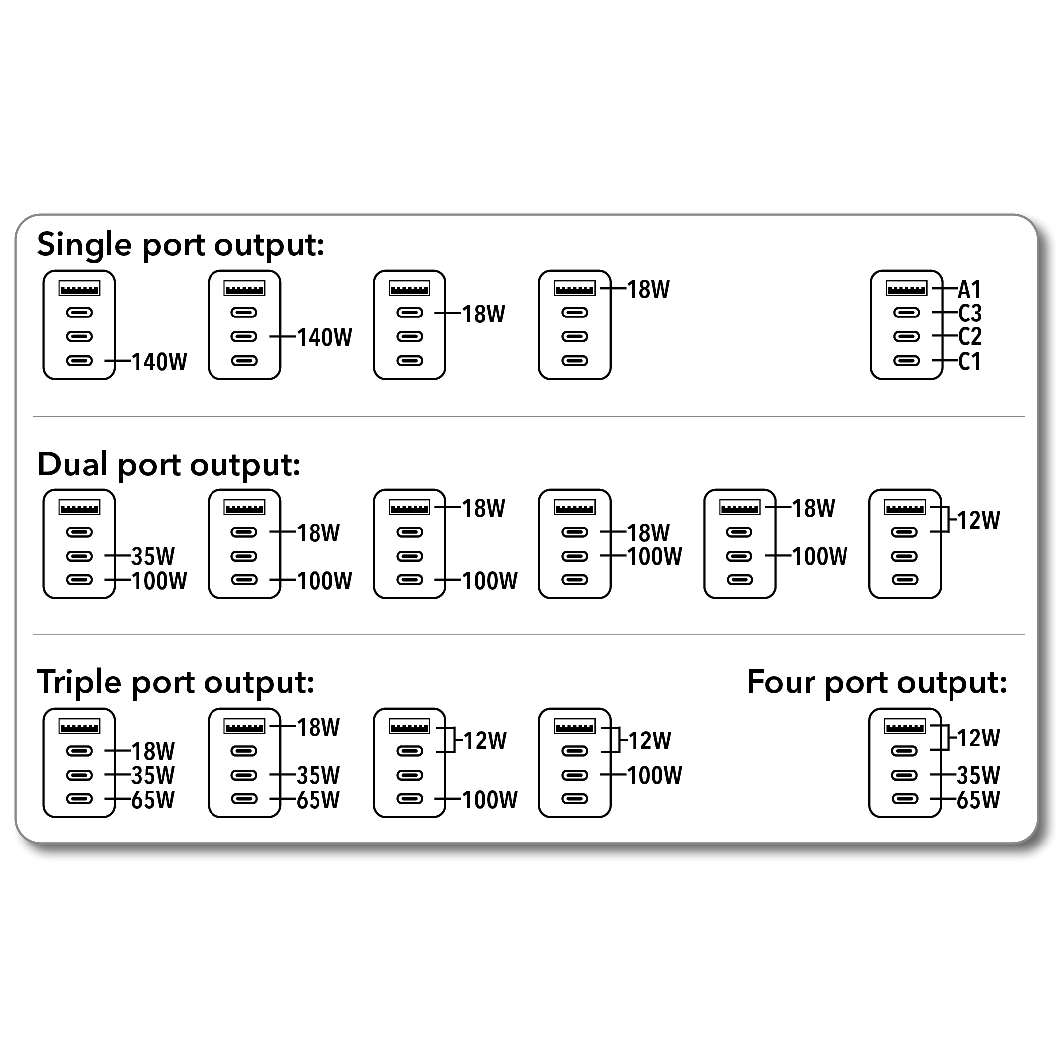 All four USB ports deliver ultra-fast charging. Two USB-C ports support Power Delivery 3.1 (with PPS support) and Quick Charge 4+ output, up to 140W each, a third USB-C port supports Power Delivery 3.0 and Quick Charge 3 output, up to 18W and the single USB-A port supports Quick Charge 3.0 output, up to 18W.