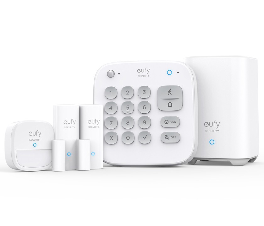 Includes HomeBase, keypad, motion sensor, and 2 entry sensors; control via the eufy Security app. No monthly fees; one-time purchase.