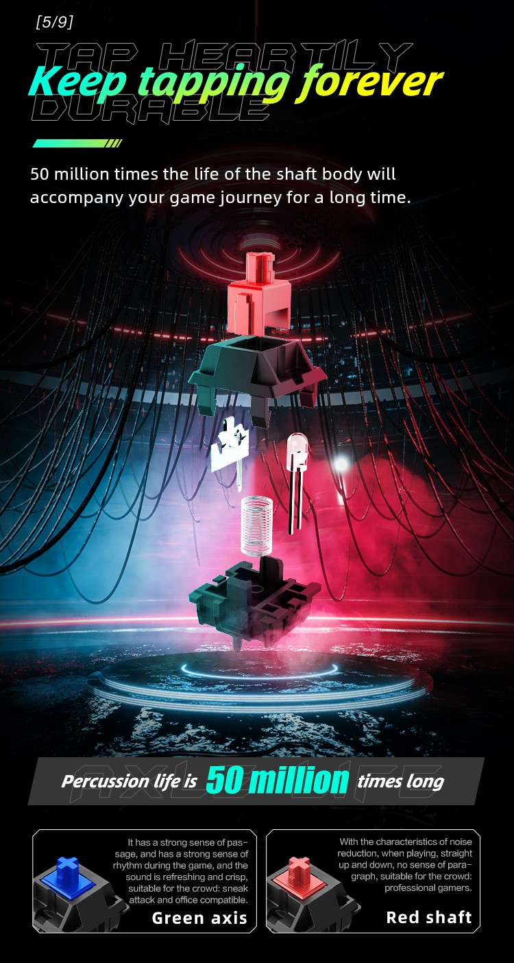 - Ultra-Durable 50 Million Cycle Mechanical Switch: Blue Switches with Distinct Tactile Feedback and "Click" Sound