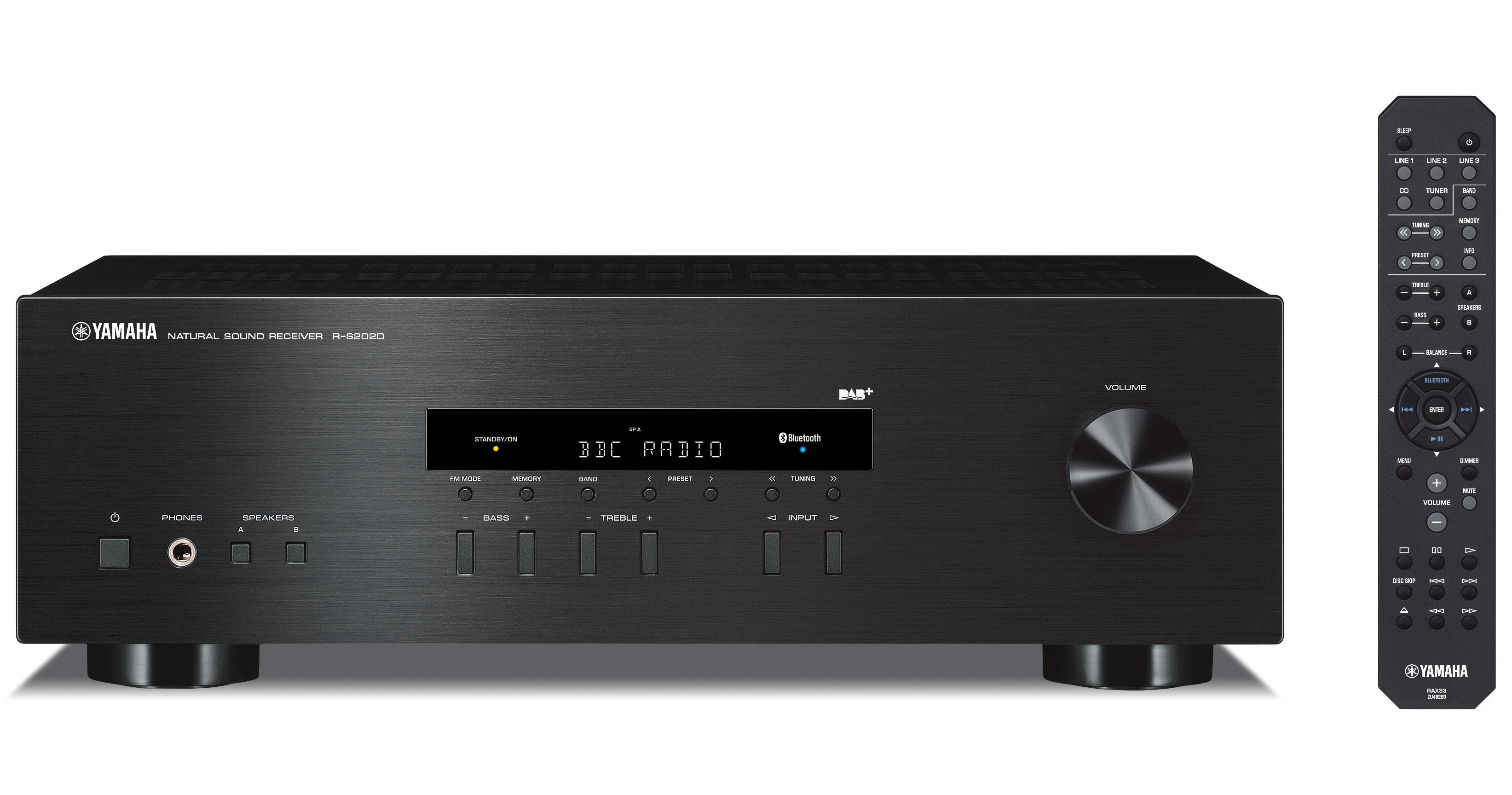 Yamaha R-S202D Hi-Fi receiver with renowned sound and clean design; Bluetooth and a DAB/DAB+ tuner for digital broadcasts.