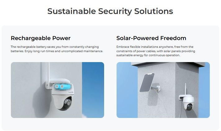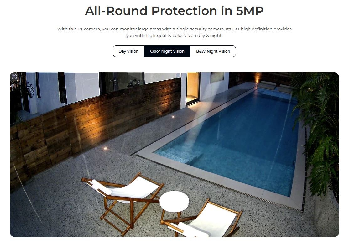 Outdoor battery-powered 5MP PTZ camera with ARGUS PT Dual, color night vision; solar powered; dual-band 2.4/5 GHz Wi-Fi.