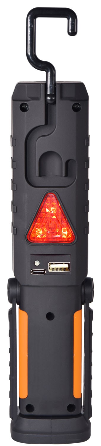 3-in-1 handheld rechargeable work light with swivel hook and magnet; also functions as USB-A powerbank.