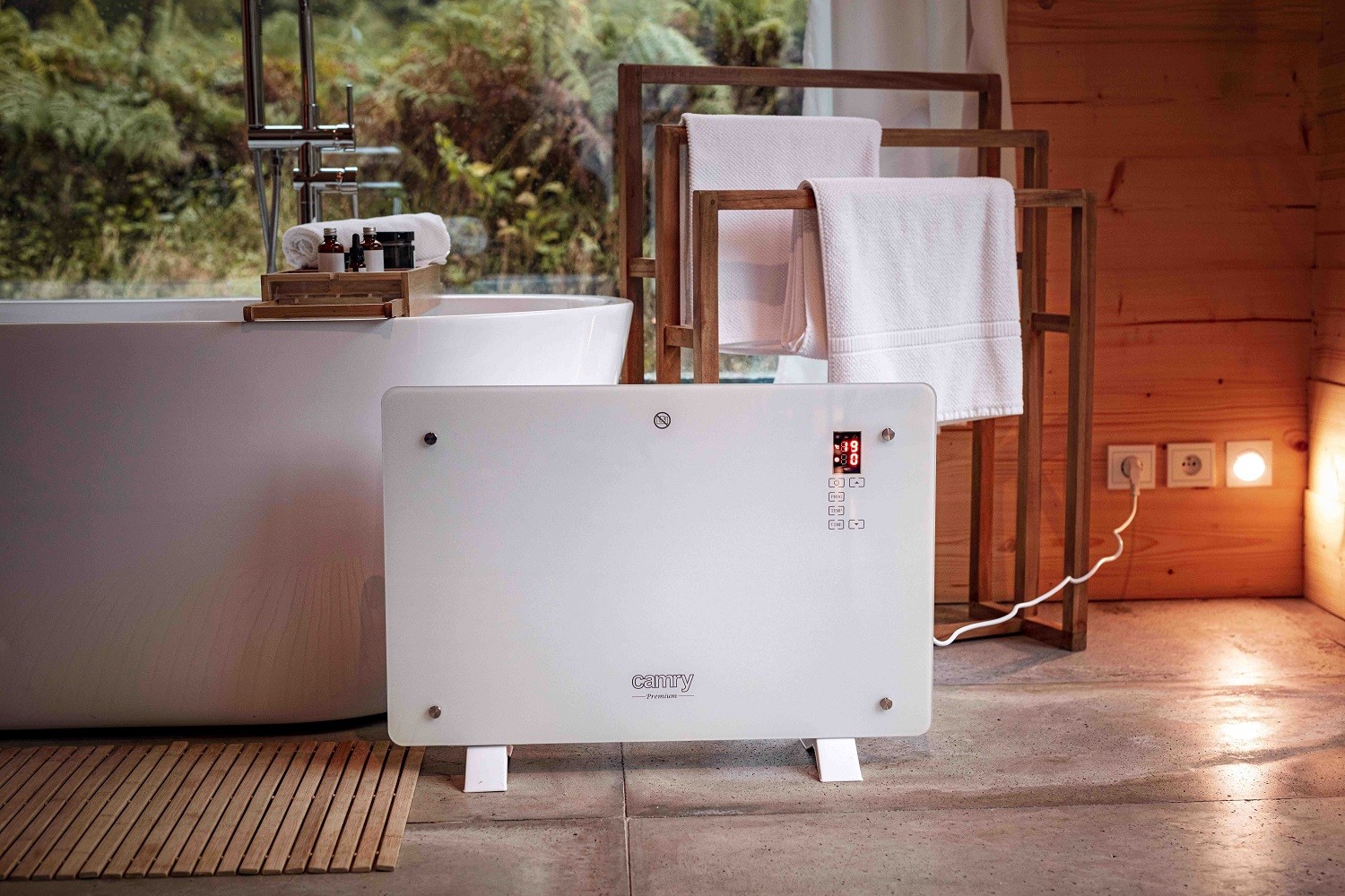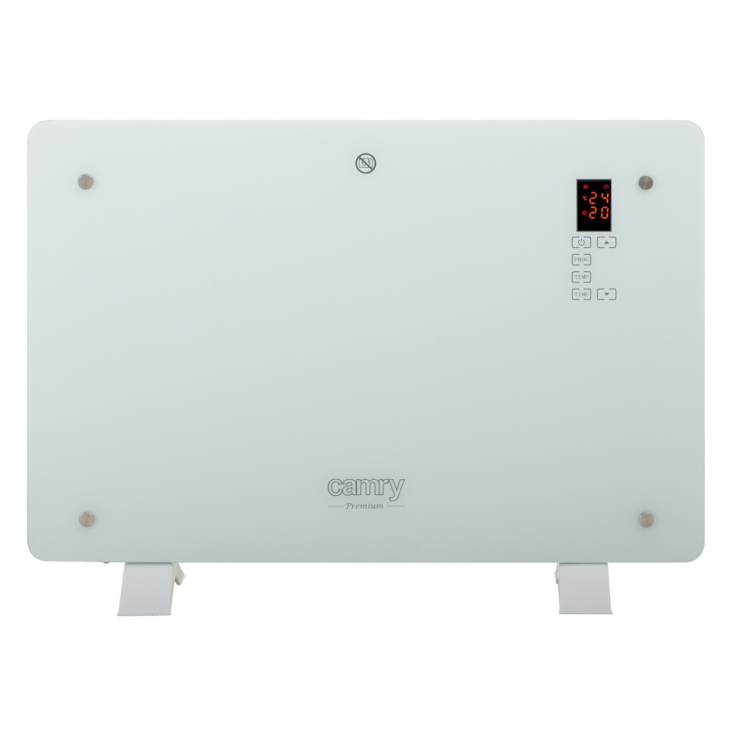 Camry CR7721 Convection Glass Heater featuring a glass surface, LCD display, touch control, remote, 1–24 h timer, 750/1500W heat, 5–35°C range, room temp sensor, safety switch.