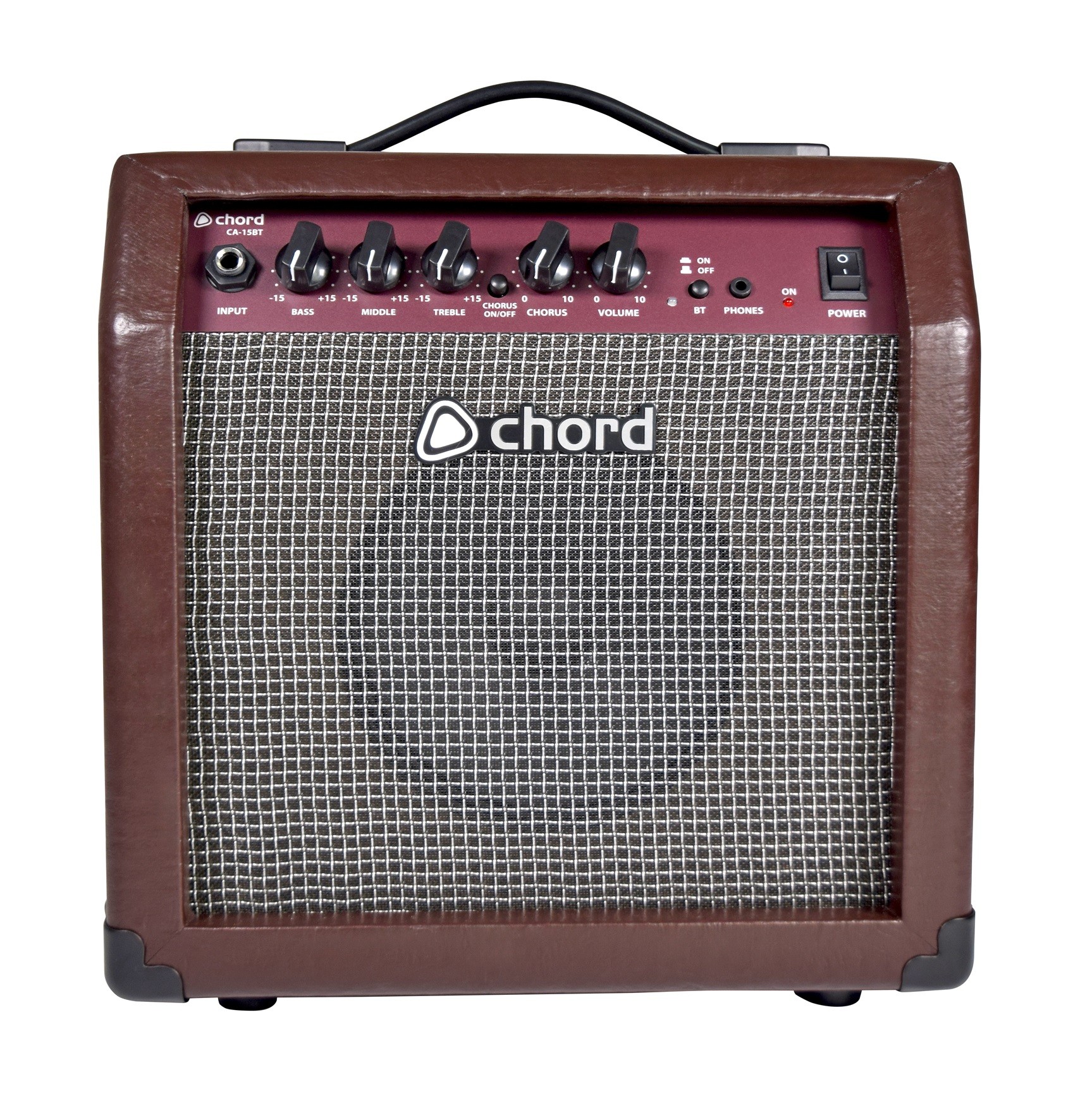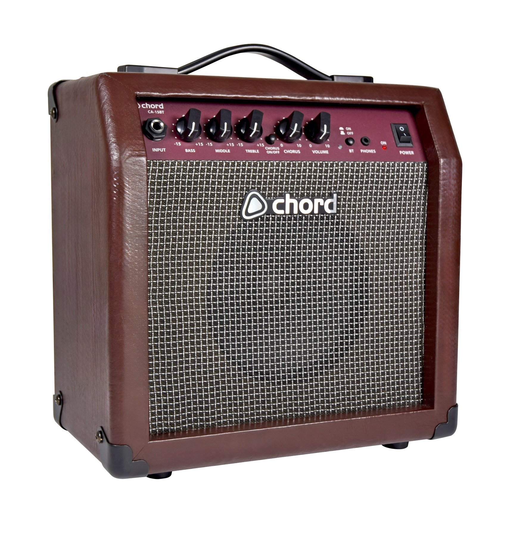 Combo amplifier for electro-acoustic guitars with 3-band EQ and built-in chorus effect. A built-in Bluetooth receiver enables playback of backing tracks from a smart phone and a stereo jack output is provided for silent practice with headphones. The 15 Watt amplifier section drives a full-range speaker set, fitted into a closed back speaker cabinet. Finished in durable brown vinyl covering with a basket weave speaker cloth.