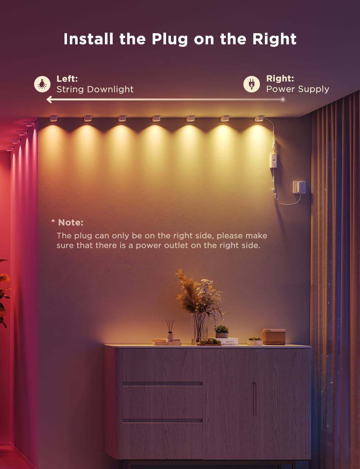 - Easy Installation: You need to put the power supply on the right when you install the string downlights on the wall. These smart downlights are adaptable to most curvatures and corners for flexible installation options