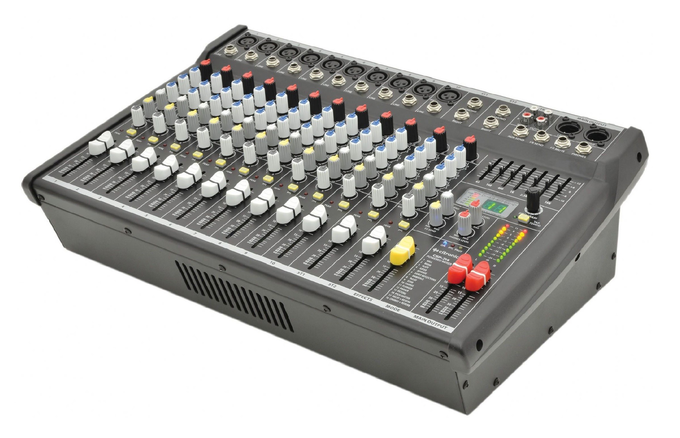 Powered mixer with balanced mic/line inputs, 2 stereo channels with 3-band EQ and aux send; 16-program DSP with tap tempo, 7-band graphic EQ and built-in stereo amp.