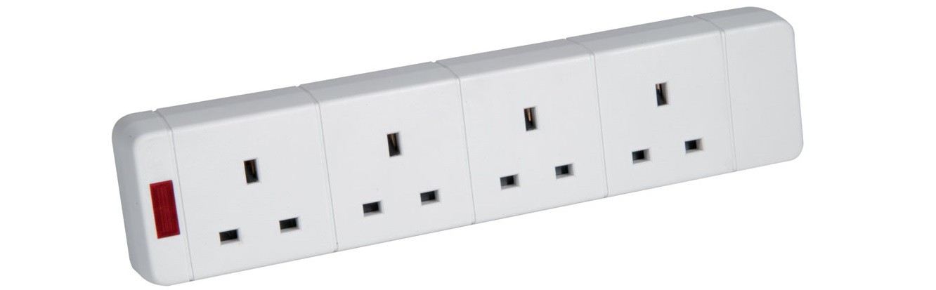 4-gang trailing socket with neon, 13A rating, BS1363/A compliant, with keyholes, rewiring capability.