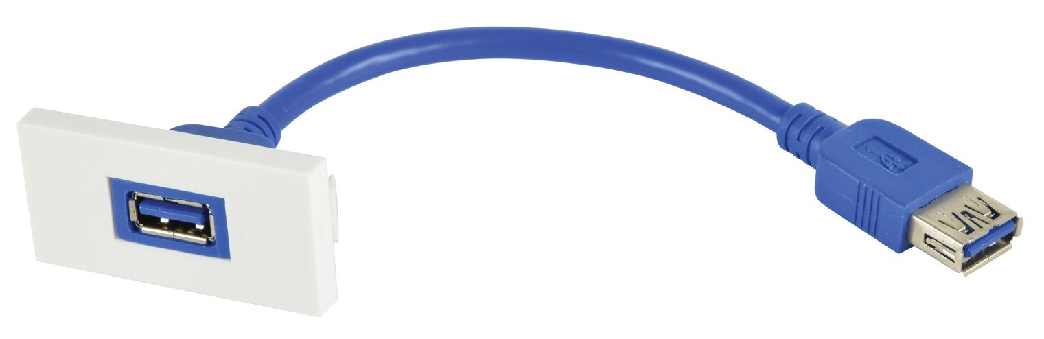 50mm x 25mm clip in module with a high speed USB3.0 type-A socket and female tail to the rear. Ideal for connecting USB peripherals and devices in a different location without the need for trailing wires. Suitable for domestic, commercial or educational applications.
