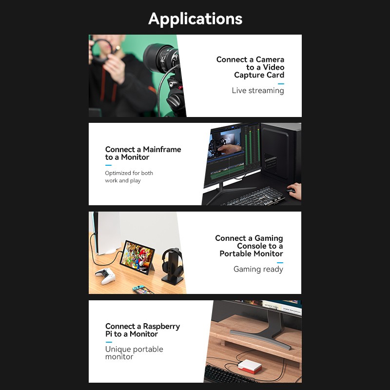 - Compatibility: Wide compatibility with devices like digital cameras, Raspberry Pi, tablets, monitors, TVs, gaming consoles, laptops, and more.
