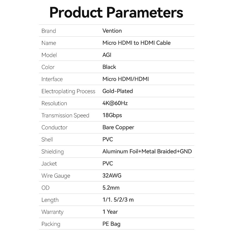 Vention HDMI to HDMI Micro Cable - AGIBG - HDMI to HDMI Micro Cable 1.5m