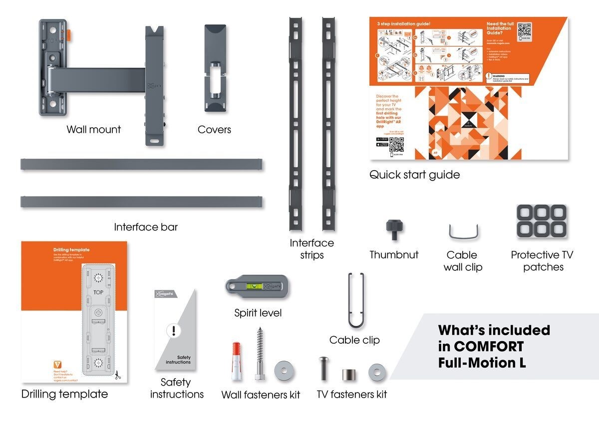 - Wall mount, Cable clip, Wall mounting kit with fischer® Duo Power plugs, TV fasteners kit, Protective TV patches, Spirit level, Quick Installation Guide, DrillRight™ AR app, Drilling template