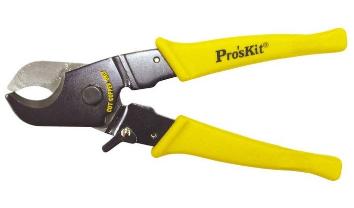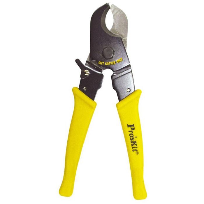 Proskit cable cutter, 215mm length; S45C carbon steel; safety lock; cuts thick wire up to 2/0 (70mm²) and RG-174/RG-9 coax.