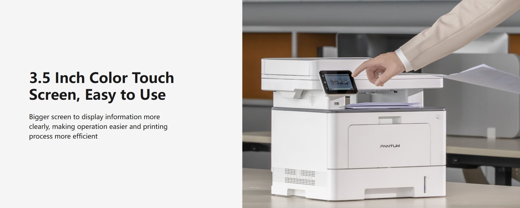 Pantum BM5100FDW Mono laser multifunction printer Extraordinary Office Assistant, Offering Excellent Printing Experience Automatic Duplex Printing, High-efficiency Output A4 printing speed is 40 pages per minute, and it supports automatic duplex printing, which can easily improve work efficiency Wireless Printing, Convenient Experience Through dual-band Wi-Fi (2.4G and 5G), NFC touch connection and other methods, wireless printing can be easily realized, and free office work style of users in the new era can be enjoyed 3.5 Inch Color Touch Screen, Easy to Use.