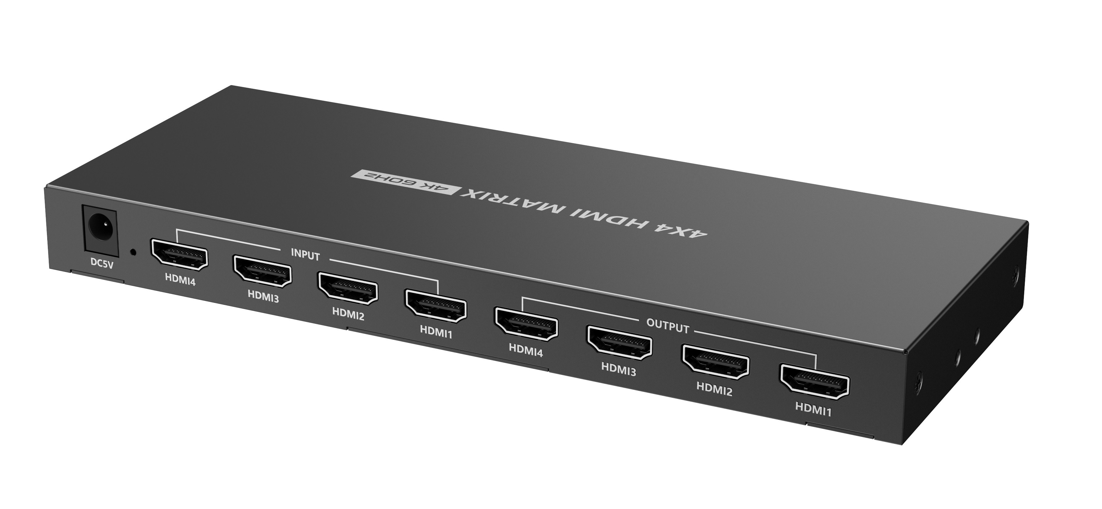 This is a 4 in 4 out HDMI matrix switch, it can switch 4 HDMI input signals to 4 HDMI displays as needed. It supports up to 4096x2160@60Hz HDR UHD resolution, and a variety of switching methods (IR remote control, buttons and RS232).