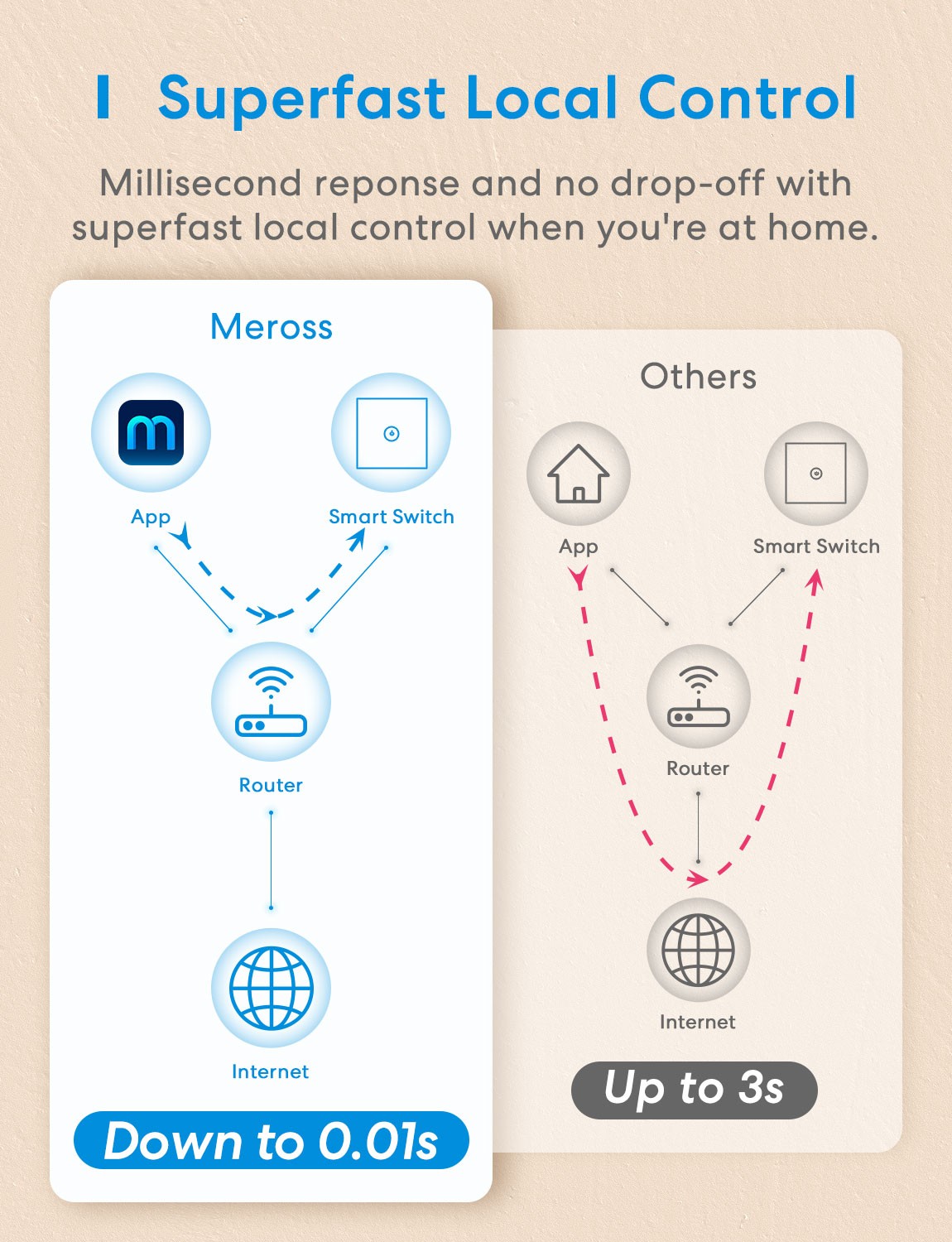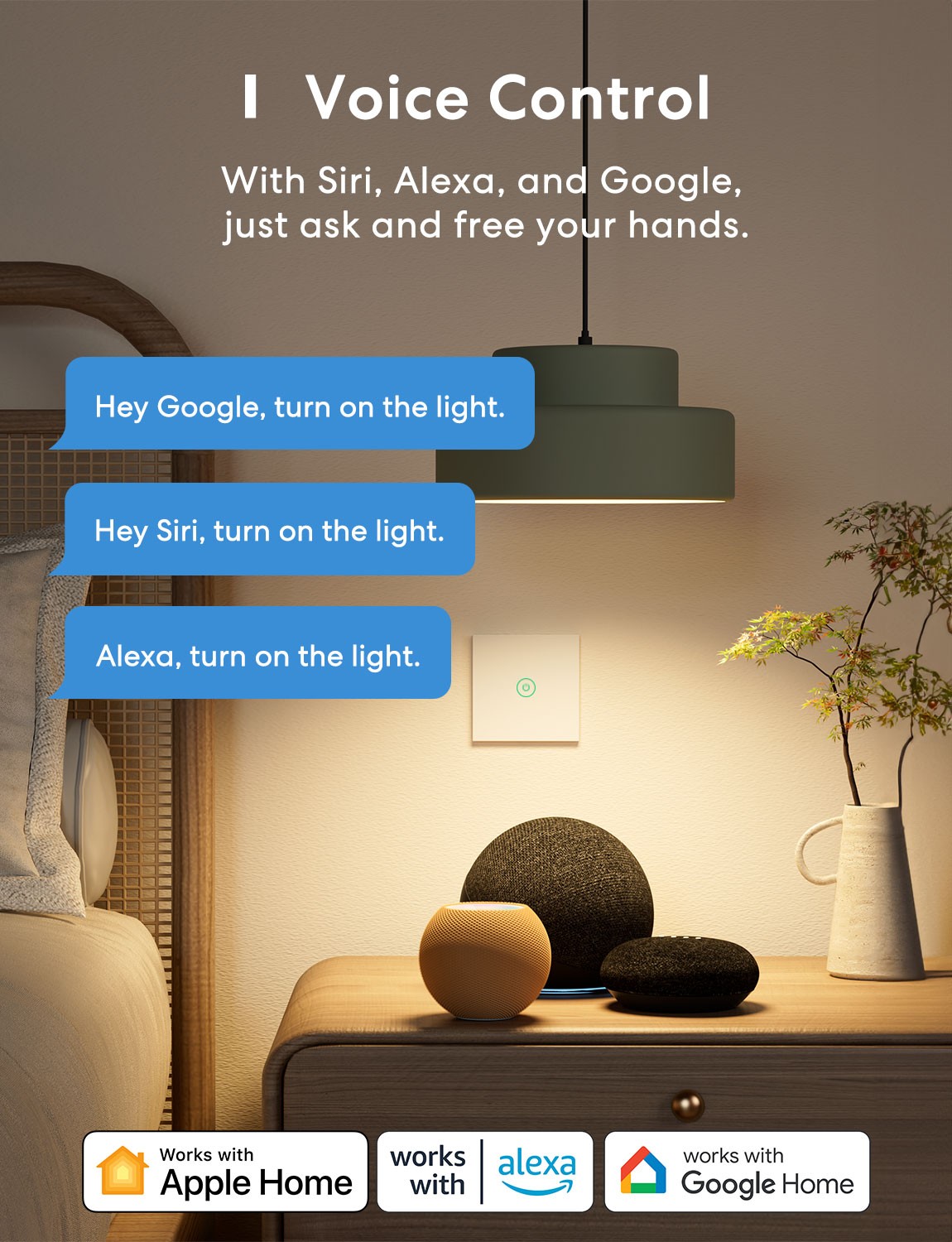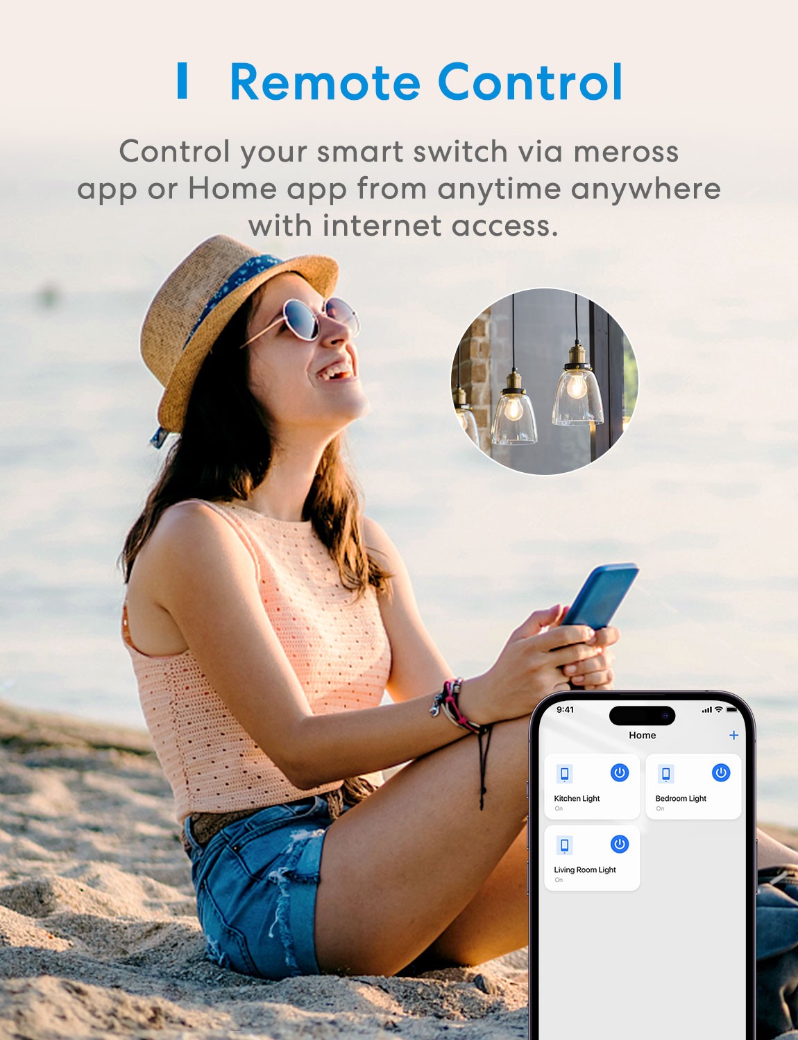 Control lights from anywhere with the Meross app. Works with HomeKit, Alexa, and Google Assistant; schedule on/off and auto-off timers.